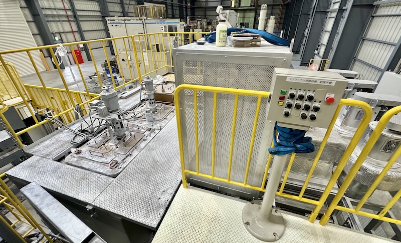 マグネシウムダイカストの溶解炉は、マグネシウム合金を効率的に溶解するための設備です。耐熱性と耐腐食性に優れた材質を使用し、高温に対応可能となり、酸化防止のため保護ガス(SF6など)を使用します。溶解温度は約650℃前後で制御され、高精度の鋳造プロセスを支援します。本施設は、YAMATO社及びTOKAI社製で、1700kg保持タイプの電気式溶解炉となってます。